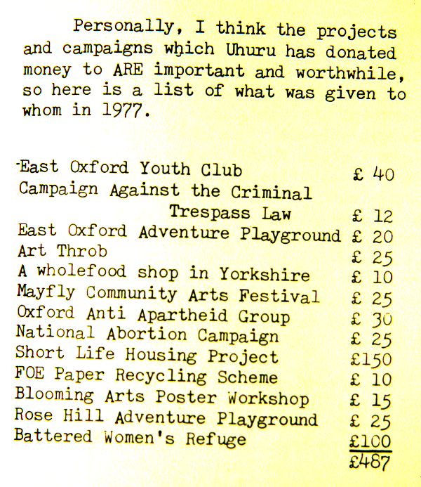 January 1978: In response to controversy over rising prices at Uhuru, a list of good causes supported by the shop was published in the Backstreet Bugle, No. 3, p.10. Courtesy Backstreet Bugle Collective.